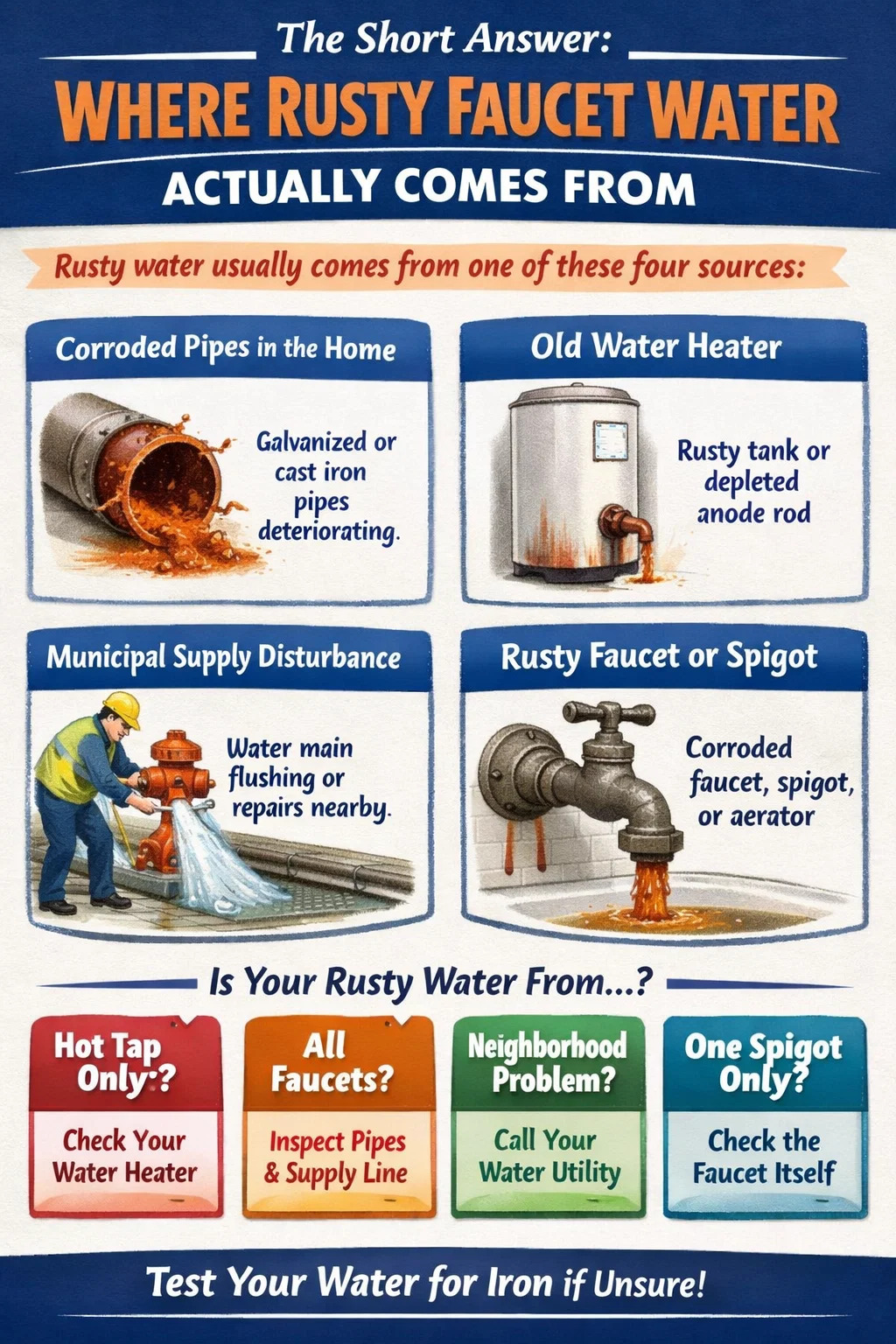 Rezavá voda z vodovodních baterií je téměř vždy způsobena jedním ze čtyř zdrojů: zkorodovaným železným nebo ocelovým potrubím uvnitř vašeho domova, poškozeným ohřívačem vody, poruchou usazenin v obecním vodovodním potrubí nebo zoxidovaným hrdlem nebo armaturou v místě dodávky. Oranžový, hnědý nebo načervenalý odstín, který vidíte, je oxid železa – rez – který se buď odloupl z vnitřku potrubí a vstoupil do vodního proudu, nebo se rozpustil přímo ve vodě, když prochází stárnoucí infrastrukturou.