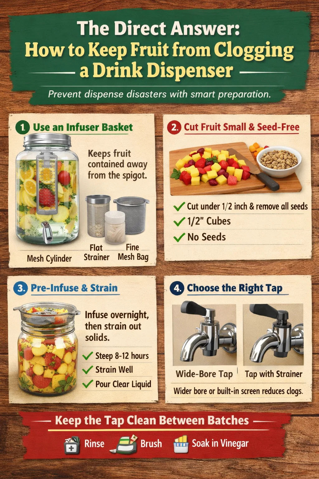 Jeden často opomíjený krok: Před přidáním citrusového nebo peckovinového ovoce vždy odstraňte semínka . Jediné semínko citronu usazené v kovovém kohoutku dávkovače nápojů může snížit průtok na pramínek za méně než pět minut používání.