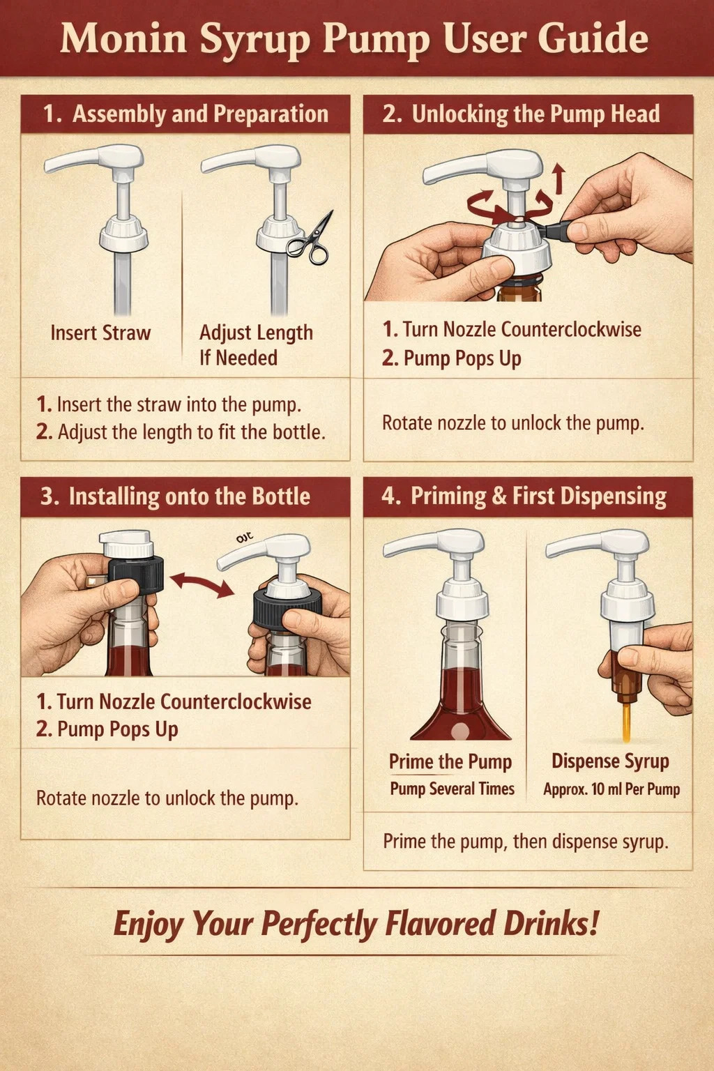 U pumpy na sirup Monin, klasické barové pomůcek, při jejím správném použití bude příprava nápoje plynulejší a lépe zachová kvalitu sirupu.
