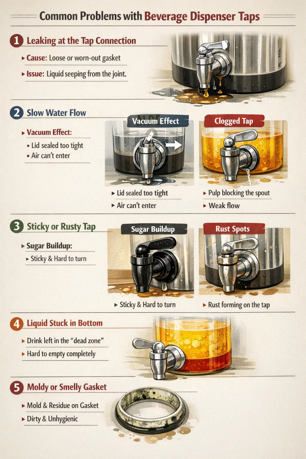 Při používání dávkovačů nápojů, i když se zdají designově jednoduché, můžete narazit na některé frustrující drobné problémy. To platí zejména pro hlavní komponentu - Kovový kohoutek na nápoje – který je nejnáchylnější k problémům, pokud není správně udržován.