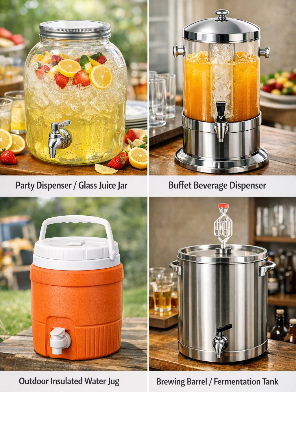 V našem každodenním životě mají tyto nádoby s malým kohoutkem, kde se lidé shromažďují, aby si dali nápoje, několik různých jmen v závislosti na jejich vzhledu a použití. Pokud hledáte online nebo se ptáte v obchodě, pomocí následujících názvů získáte ten správný výsledek: