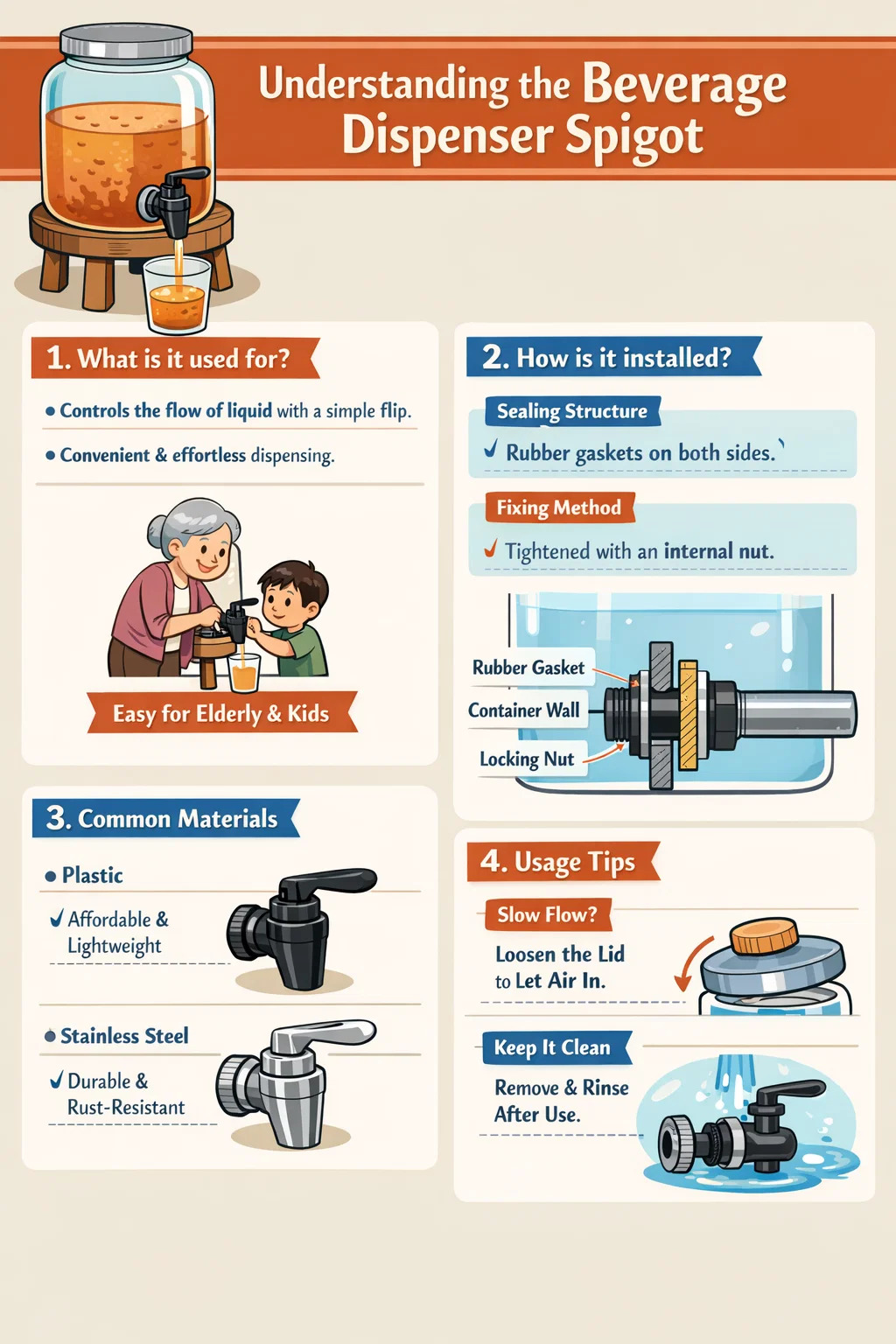 Nápoj dávkovače nápojů je malý kohoutek nebo ventil nainstalovaný na dně nádoby na nápoje nebo vodní nádrže. Je to srdce celého kontejneru; bez ní byste museli zvednout těžkou nádobu, abyste nalili tekutinu.