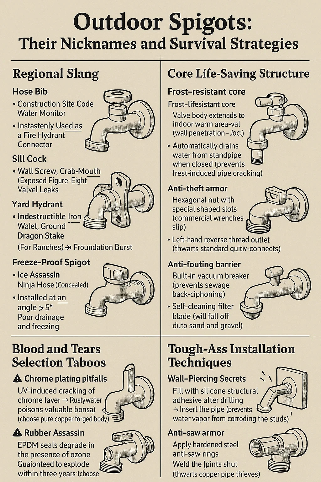 | Sill Cock | Slitherin' Snake po zdi | Krabí dráp (odhalené stonky) | Chybné vnitřní závity → zatopení uvnitř stěn |